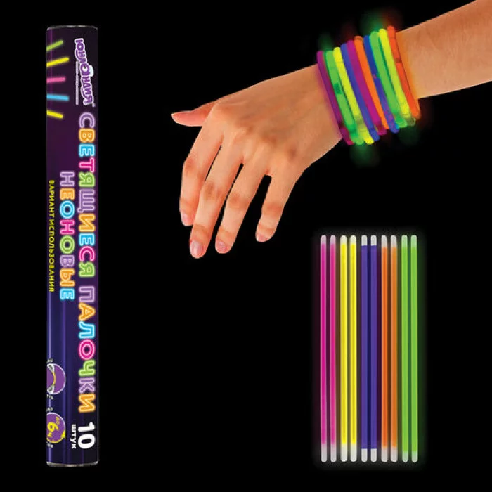 Светящиеся (неоновые) палочки ЮНЛАНДИЯ отлично подойдут для праздников, вечеринок, концертов и отдыха на природе. Дают неоновое свечение пяти разных цветов. Палочки водонепроницаемые и могут быть использованы в дождливую погоду и даже под водой на небольшой глубине. Светятся до 6 часов. Для активации палочку следует надломить в нескольких местах и тщательно потрясти, чтобы сделать свечение более равномерным. Вставив оба конца палочки в коннектор, можно сделать яркий браслет.В комплекте: 10 светящихся палочек, 10 коннекторов.