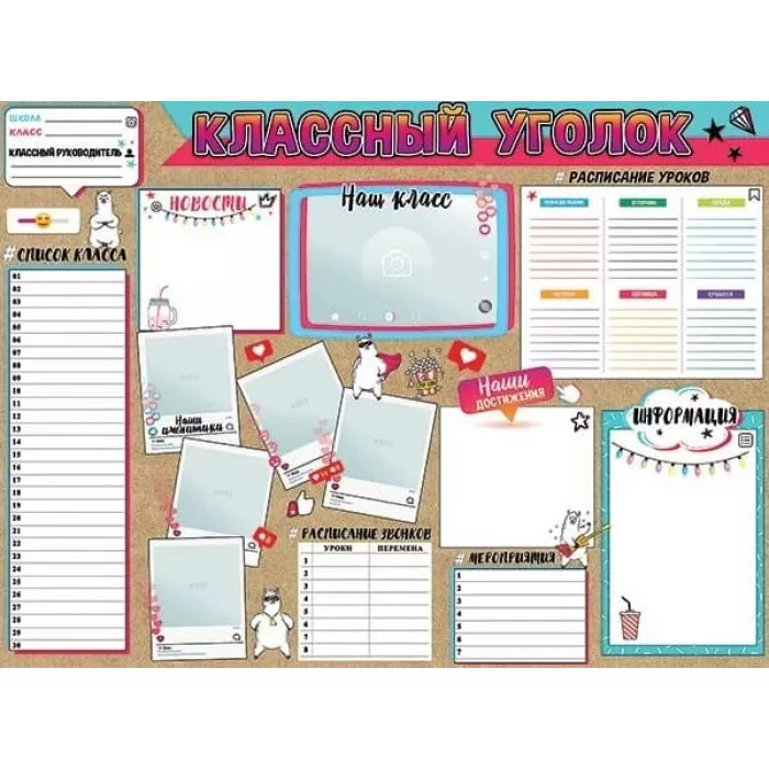 Очень полезная вещь в любом классе! Представляем вашему вниманию классный уголок формата А2. Данный плакат поможет как ученикам, так и учителям сориентироваться в расписании уроков, не забыть о графике дежурств, вспомнить о предстоящих событиях. Яркий и современный дизайн обязательно придётся по душе школьникам.
