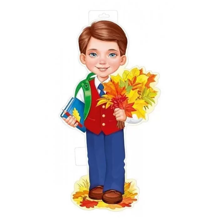Двусторонний вырубной плакат — мальчик в школьной форме с букетом осенних листьев. Подойдет для подготовки к празднику Осени, 1 Сентября, ко Дню учителя. Может использоваться в качестве настенного украшения или декорации.