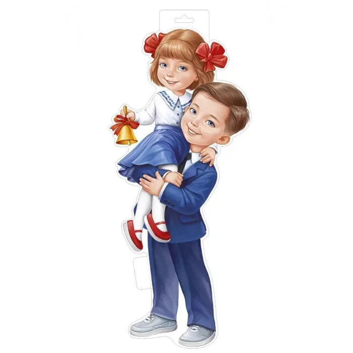 Двусторонний вырубной плакат — мальчик в школьной форме держит на руках девочку с колокольчиком. Подойдет для подготовки к празднику Осени, 1 Сентября, ко Дню учителя. Может использоваться в качестве настенного украшения или декорации.