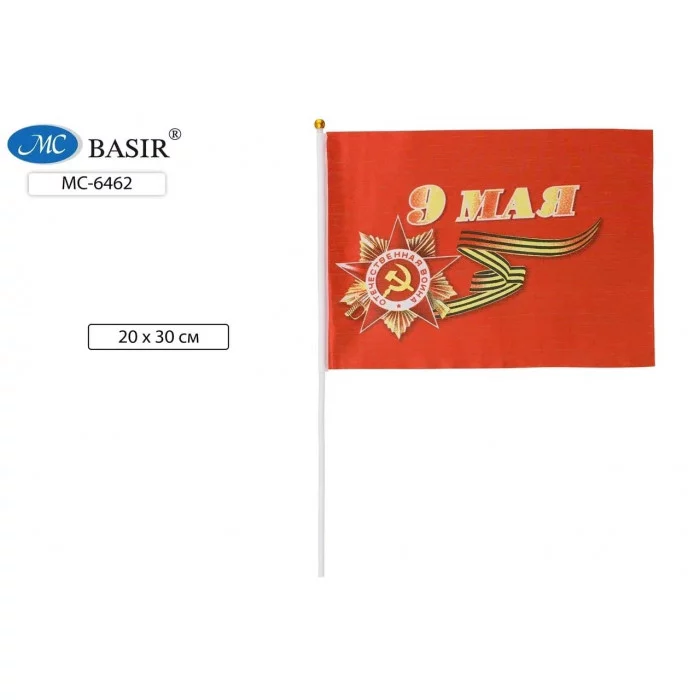"Флаг 9 МАЯ" на пластиковой трубе, материал-искусственный шёлк, цвет красный, размер 20*30 см (МС-6462):