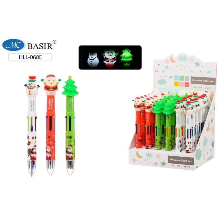 Авторучка 6-ти цветная: детская; "НОВОГОДНИЕ"; цветной корпус с рисунком, прорезиненный наконечник-ф HLL-068E