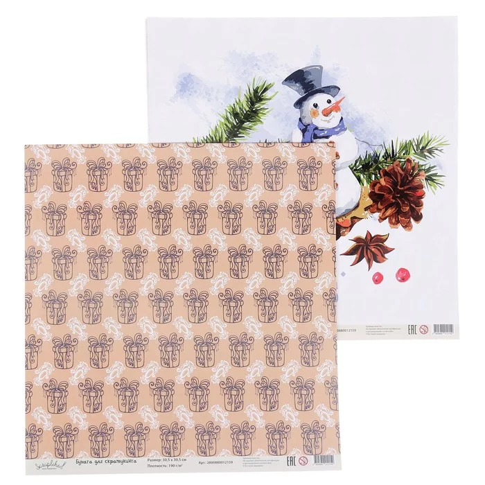 Бумага для скрапбукинга "Новый год. Снеговик и подарки" 30, 5х30, 5 см 190г/м2 2867302
