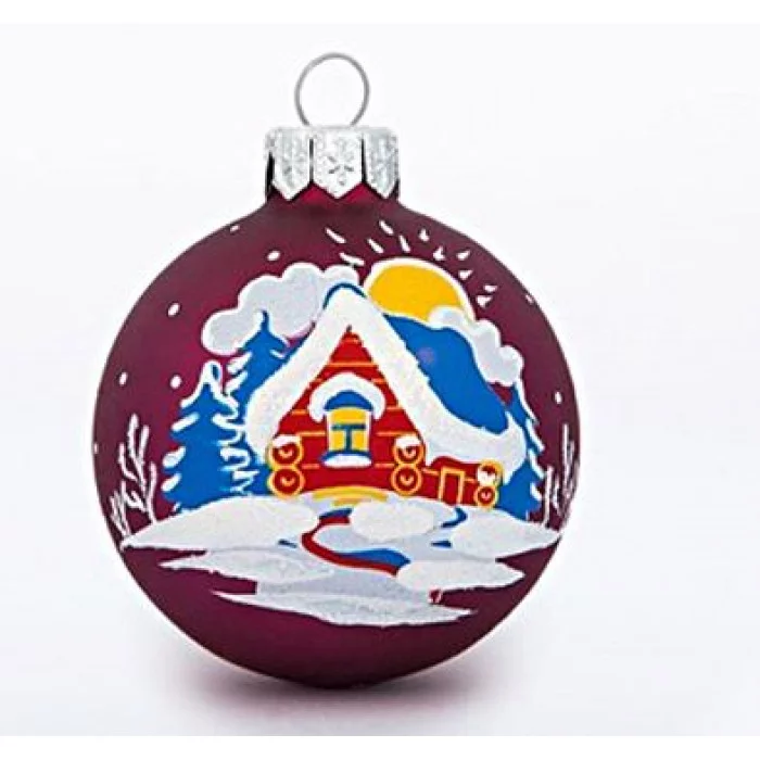 Диаметр 6 см. Декорирован росписью в виде заснеженной избушки и восходящего солнышка, а также переливающейся крошкой. В индивиальной упаковке. Украшение для удобства имеет ушко для ниточки или крючка. Небольшими шариками можно украсить елочку, а также составить мини-гирлянду, собрав на декоративные ленты несколько шариков вместе. Шариками принято украшать новогоднюю елочку, а также декорировать хвойные гирлянды, вписывать в композции, подвешивать на любые уместные предметы интрьера. Елочка или интерьер, украшенные шариками будут смотреться невероятно празднично и эстетично, особенно, если выдержать все украшения в одной цветовой гамме или стиле. Цвета в ассортименте.