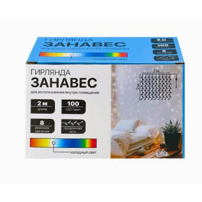 Гирлянда-занавес никого не оставит равнодушным! Она поможет создать теплую и уютную атмосферу в доме в любое время года. Гирлянду можно повесить на окно или стену, использовать в качестве ночника. 8 режимов. Свет: холодный белый. Размер: 2х2 м. Количество ламп: 100 шт.