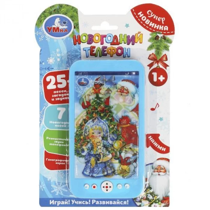 Вашего малыша приведёт в восторг эта игрушка в виде яркого телефона. Он с удовольствием будет нажимать на кнопки, слушать весёлые новогодние песни и забавные звуки. Благодаря компактному размеру телефон удобно повсюду брать с собой.
