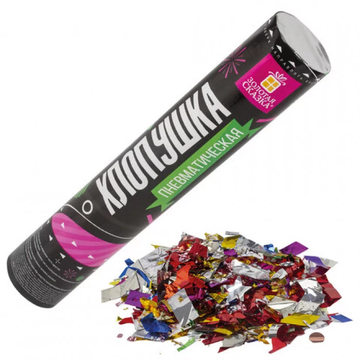 Пневматическая хлопушка ЗОЛОТАЯ СКАЗКА предназначена для создания отличного настроения и атмосферы настоящего веселья на любом празднике - новогодней вечеринке, торжестве в честь Дня Рождения, выпускном, корпоративе или любом другом праздничном событии. Хлопушка высотой 30 см с фольгированным наполнителем в виде конфетти цвета ассорти является абсолютно безопасной. Выстрел осуществляется под действием сжатого воздуха. Не является пиротехникой. Средняя дальность выстрела – 5-7 м. Корпус хлопушки состоит из двух частей: пневматического баллона со сжатым воздухом и картонного цилиндра с наполнителем. Рекомендуется использовать хлопушку внутри больших помещений или на улице. Тип: пневматическая. Длина: 30 см. Количество в комплекте: 1 шт.. Материал наполнителя: фольга. Основной наполнитель: конфетти. Цвет наполнителя: ассорти Бренд - ЗОЛОТАЯ СКАЗКА. Производитель - Китай. . Штрихкод - 4606224287126