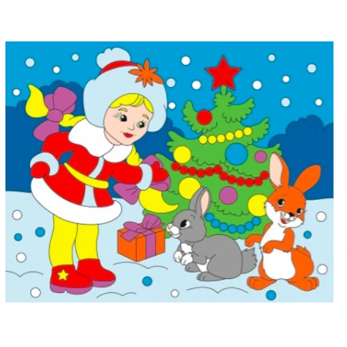 Холст с красками 20х25 см по номерам. Снежная девочка и зайки у ёлки (Арт. Х-1248) Х-1248