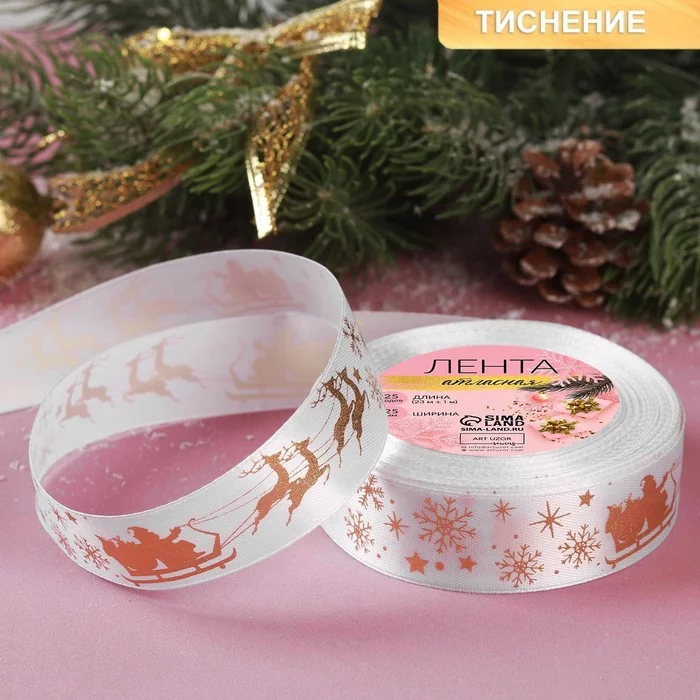 Лента атласная 25мм*25±1ярд олени в упряжке №01 белый/тиснение золото АУ 6784841