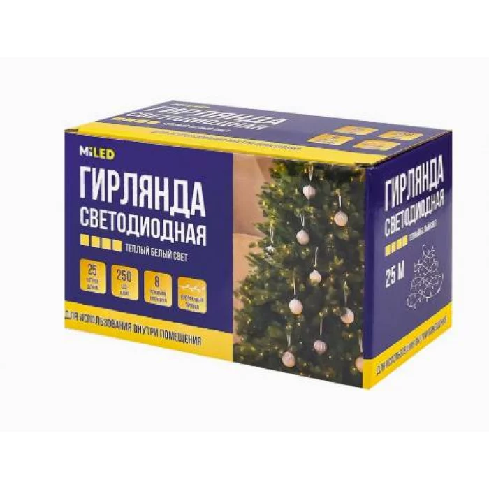 MILED Гирлянда метражная. 25 м 250 ламп тёплый белый свет 8 режимов НУ-9783