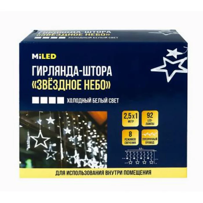MILED Гирлянда Штора. "Звездное небо" 2,5*1м 92 лампы 8реж. холодный белый свет ГШ-0027