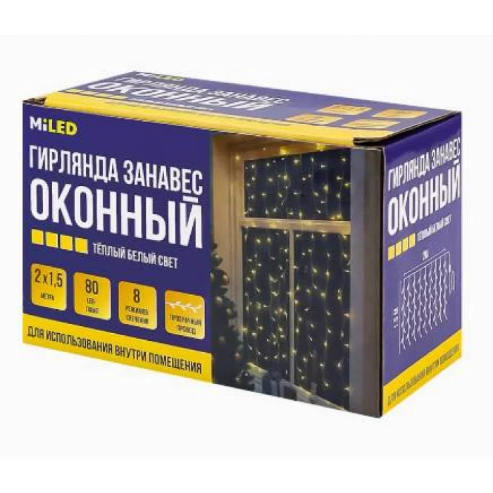 MILED Гирлянда Занавес. 2*1, 5 м 80 ламп тёплый белый свет 8 режимов ГЗ-0035