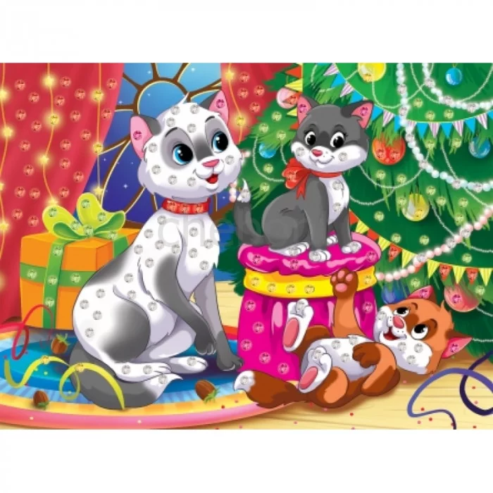 МОЗАИКА ИЗ СТРАЗ. КОШКА С КОТЯТАМИ У ЁЛКИ (Арт. М-1272)