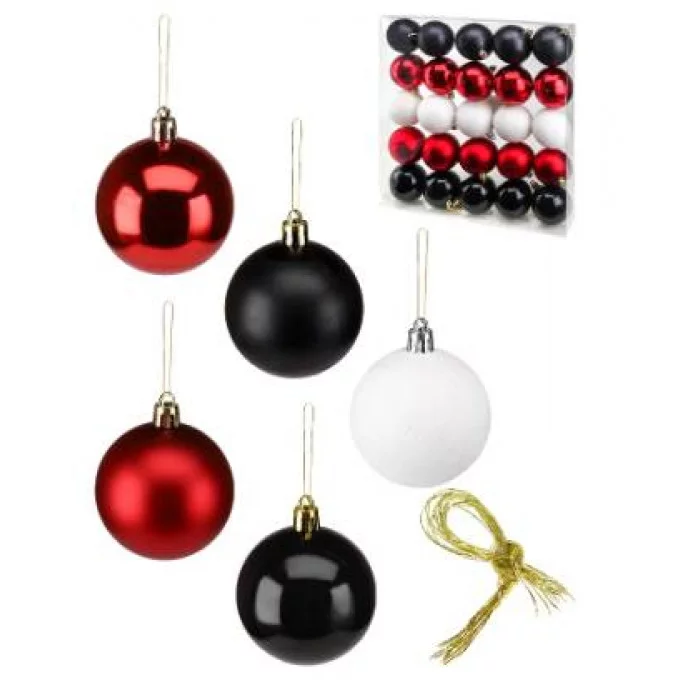 Шар — незаменимое ёлочное украшение, которое поможет создать невероятно уютную атмосферу Нового Года! Набор ёлочных шаров в едином стиле прекрасно подойдёт для декора ёлки или других элементов интерьера. Шары прослужат вам долгие годы, так как сделаны из прочного пластика. Вам не придётся беспокоиться, что дети или животные их разобьют! Размер: 6 см. В наборе 25 шт. Цвет: красный, черный,белый.