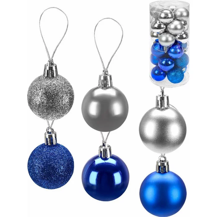 Шар — незаменимое ёлочное украшение, которое поможет создать невероятно уютную атмосферу Нового Года! Набор ёлочных шаров в едином стиле прекрасно подойдёт для декора ёлки или других элементов интерьера. Шары прослужат вам долгие годы, так как сделаны из прочного пластика. Вам не придётся беспокоиться, что дети или животные их разобьют. Размер: 4 см. В наборе 25 шт. Цвет: серебряный,синий. Материал: глитер с узором.