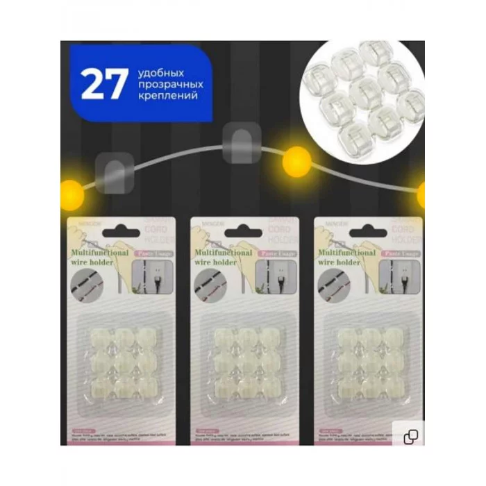 Набор самоклеящихся крючков предназначен для крепления различных проводов, кабелей, гирлянд на стенах и потолке. Держатели проводов помогут без применения специализированных инструментов организовать пространство и освободить место. Благодаря самоклеящейся поверхности крючки с лёгкостью можно зафиксировать в нужных местах и удалить без особых усилий и следов. Держатели для проводов изготовлены из прозрачного пластика, что позволит им остаться практически незаметными. Количество: 27 шт.