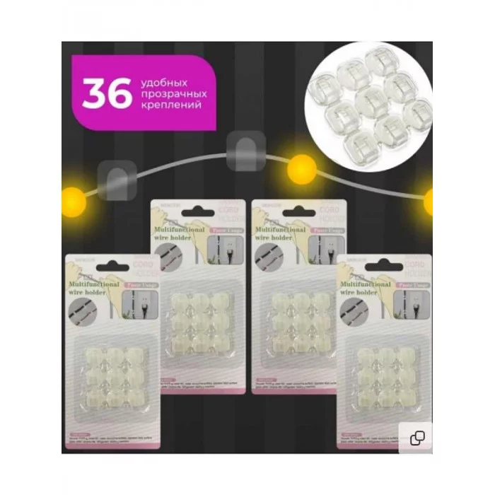 Набор самоклеящихся крючков предназначен для крепления различных проводов, кабелей, гирлянд на стенах и потолке. Держатели проводов помогут без применения специализированных инструментов организовать пространство и освободить место. Благодаря самоклеящейся поверхности крючки с лёгкостью можно зафиксировать в нужных местах и удалить без особых усилий и следов. Держатели для проводов изготовлены из прозрачного пластика, что позволит им остаться практически незаметными. Количество: 36 шт.