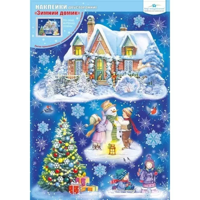 Прекрасная снежная зима, где дети лепят снеговика и катаются на санках во дворе сказочно уютного загородного домика! И, конечно, здесь же стоит празднично украшенная ёлка, летают яркие снегири и большие волшебные снежинки! Цветная композиция волшебно искрится и переливается блёстками, создавая приятную тёплую атмосферу! Двусторонние наклейки «Новогодний пейзаж» на прозрачной плёнке легко приклеиваются на окно, витрину, стены, снимаются, не оставляя следов.
