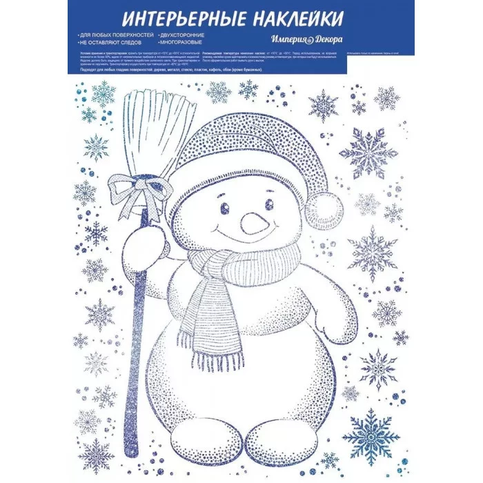 Переливающиеся наклейки в виде снеговика с метлой для оформления интерьера. Подходят для любых гладких поверхностей: дерево, металл, стекло, пластик, кафель, обои (кроме бумажных). Наклейки двусторонние, не оставляют следов — идеальны для окон. На одном листе все снежинки разного размера.