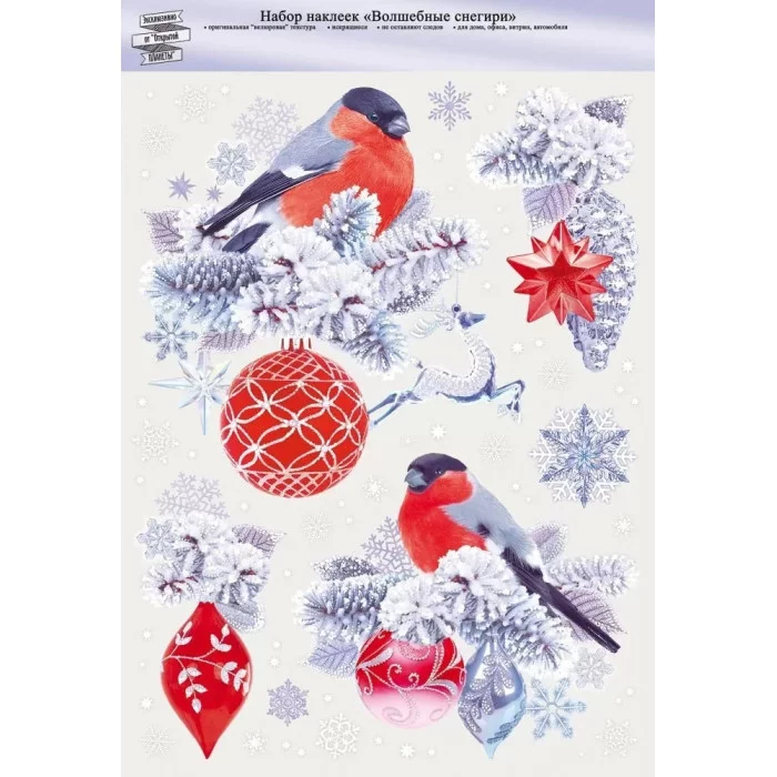 Сверкающие наклейки для праздничного декора! Белоснежный рисунок этих наклеек словно создан из искрящихся снежинок. Блестки придают сияние и эффектно сочетаются со специальным покрытием, имитирующим настоящий снег. А красные грудки снегирей и алые елочные игрушки создают яркие акценты в интерьере. Наклейки подходят для любых гладких поверхностей (кроме бумажных обоев). Кроме того, они двусторонние – а это удачное решение для декорирования окон, витрин, стеклянных дверей. Они одинаково эффектно смотрятся и изнутри, и снаружи. Легко клеятся и легко снимаются. Влагостойкие.