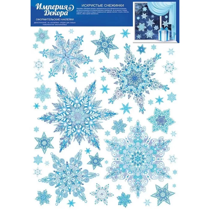 Переливающиеся наклейки-снежинки для оформления интерьера. Подходят для любых гладких поверхностей: дерево, металл, стекло, пластик, кафель, обои (кроме бумажных). Наклейки двусторонние, не оставляют следов — идеальны для окон. На одном листе все снежинки разного размера.