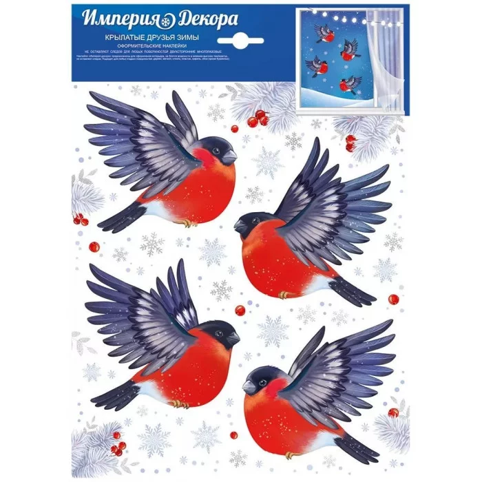 Наклейки с изображением летящих снегирей для оформления интерьера. Подходят для любых гладких поверхностей: дерево, металл, стекло, пластик, кафель, обои (кроме бумажных). Наклейки двусторонние, не оставляют следов — идеальны для окон.