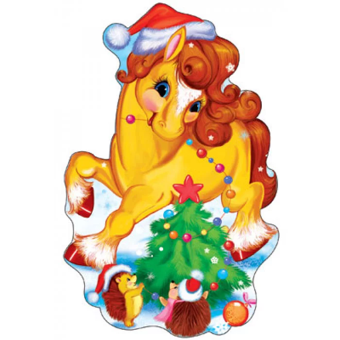 Плакат вырубной А3. Лошадка зимняя с елочкой и ежиками (с блестками и уф-лаком) Ф-7045