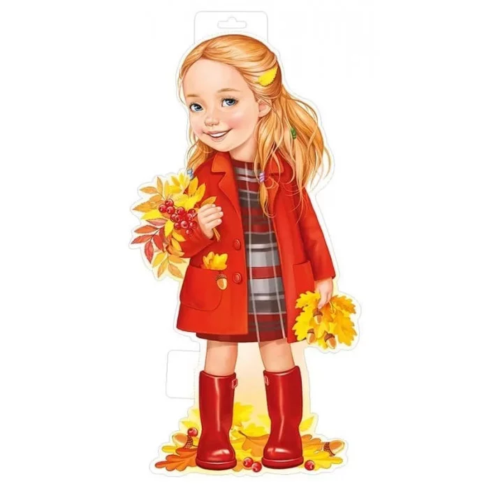 Двусторонний вырубной плакат — девочка в школьной форме с букетом осенних листьев. Подойдет для подготовки к празднику Осени, 1 Сентября, ко Дню учителя. Может использоваться в качестве настенного украшения или декорации.