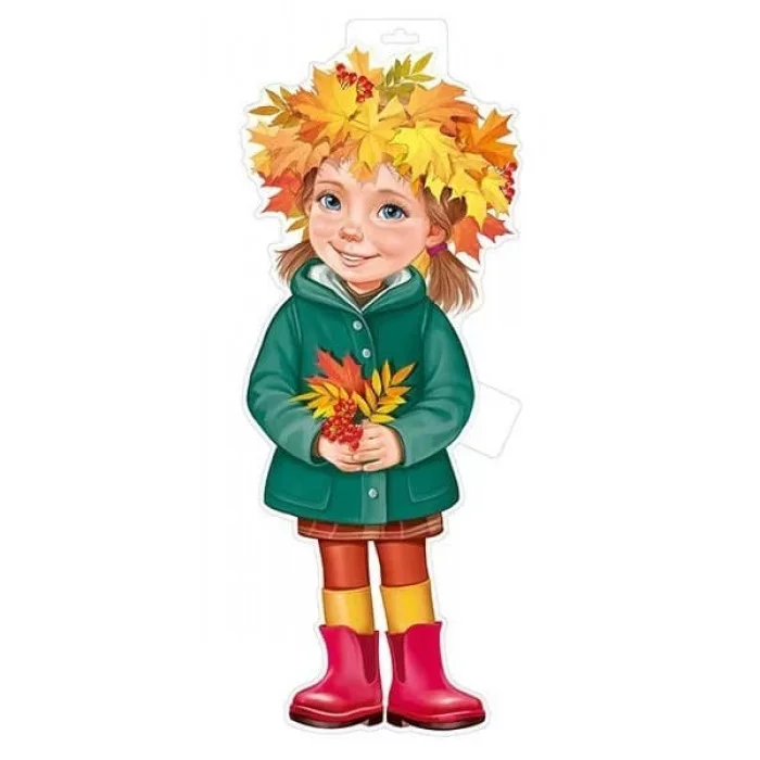 Двусторонний вырубной плакат — девочка с венком из осенних листьев. Подойдет для подготовки к празднику Осени, 1 Сентября, ко Дню учителя. Может использоваться в качестве настенного украшения или декорации.
