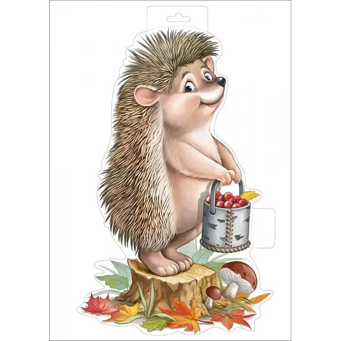 Вырубной двусторонний плакат "Ежик с лукошком на пеньке". Подойдет для подготовки к празднику Осени в качестве настенного украшения или декорации.