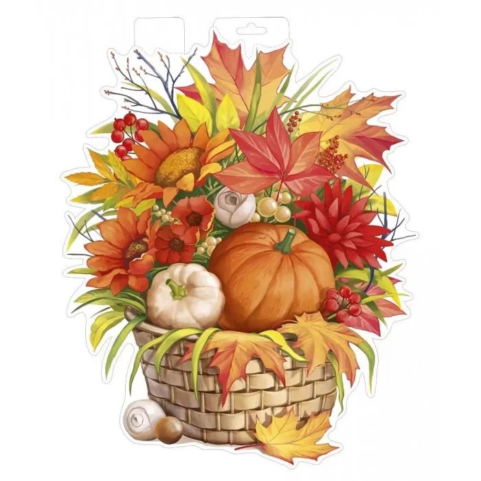 Вырубной двусторонний плакат "Осенняя корзина". Яркое изображение корзинки с тыквой, осенними листьями и цветами создаст непередаваемое осеннее настроение.