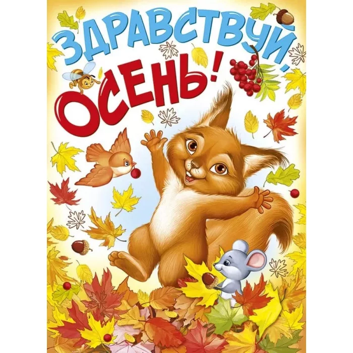 Осенний плакат «Здравствуй, осень!» для декора помещений и постановок к 1 Сентября или Празднику осени. Материал: картон. Формат: А2. Размер: 44х60 сантиметров. Преобразить школьный класс, детскую комнату или актовый зал поможет плакат для ученика (студента) с ярким рисунком и надписью.