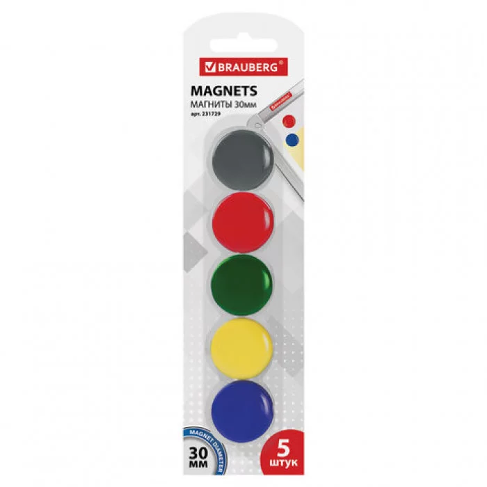 Магниты диаметром 30 мм КОМПЛЕКТ 5 штук цвет АССОРТИ в блистере BRAUBERG 231729