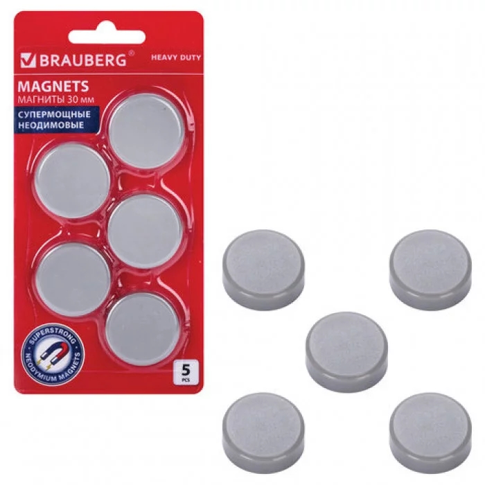 Магниты СУПЕРМОЩНЫЕ НЕОДИМОВЫЕ 30 мм НАБОР 5 шт. серые BRAUBERG HEAVY DUTY 237486