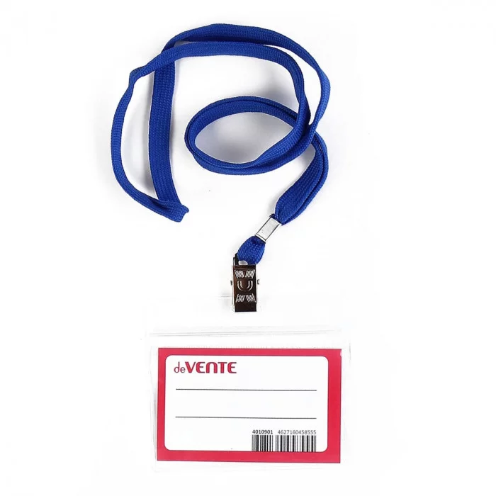 Бейдж "deVENTE", 99x66 мм, горизонтальный, ПВХ, прозрачный, с бумажным вкладышем, металлическая клипса, синий шнурок.