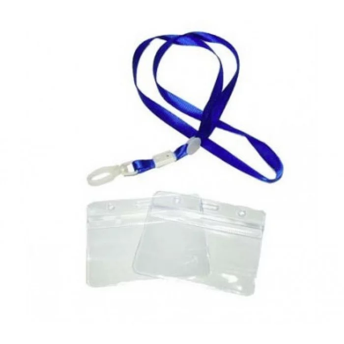 Бейджик изготовлен из прозрачного пластика. Крепление изделия осуществляется при помощи металлического зажима на тесьме. Цвет тесьмы — синий. Подходит для новешия именных карточек и пропусков.