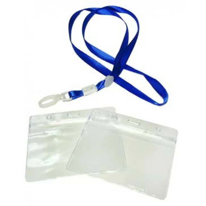 Бейджик изготовлен из прозрачного пластика. Крепление изделия осуществляется при помощи металлического зажима на тесьме. Цвет тесьмы — синий. Подходит для новешия именных карточек и пропусков.