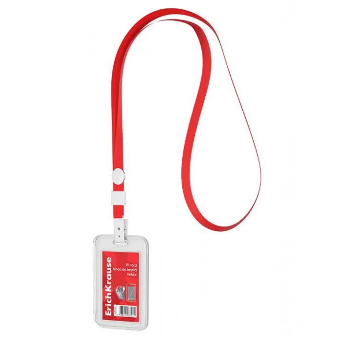 Бейдж вертикальный в комплекте с лентой ErichKrause книжка, размер вставки 54х85 мм, прозрачный, цвет ленты красный 63727