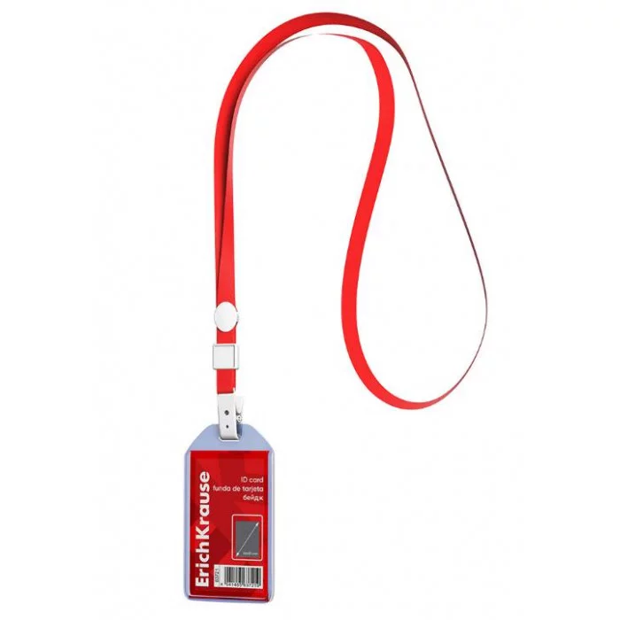 Бейдж вертикальный в комплекте с лентой ErichKrause размер вставки 54х85 мм, прозрачный, цвет ленты красный 63721