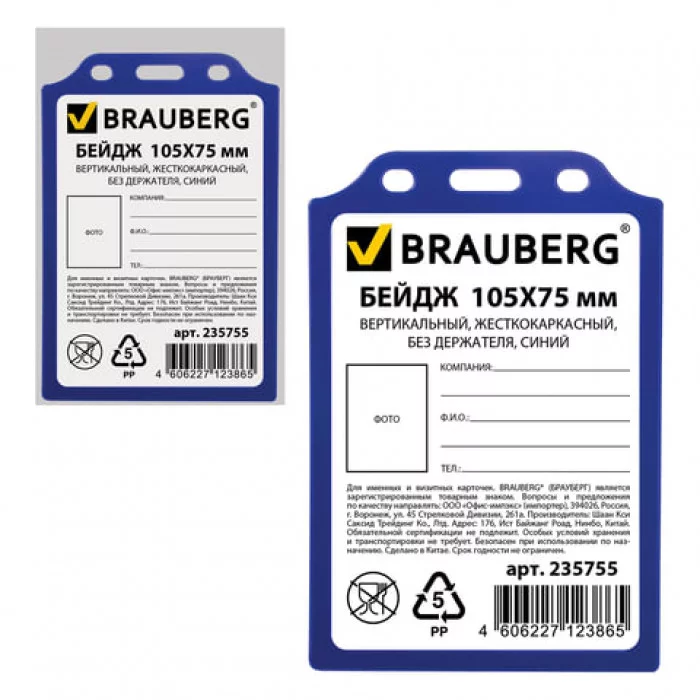 Бейдж вертикальный жесткокаркасный (105х75 мм) , без держателя, СИНИЙ, BRAUBERG, 235755