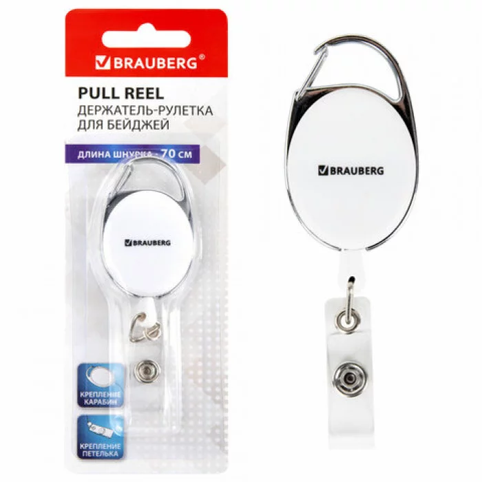 Держатель-рулетка для бейджей 70 см, петелька, карабин, белый, в блистере, BRAUBERG, 238238