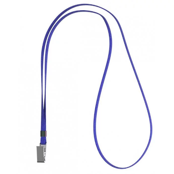 Лента для бейджа синего цвета. Лента изготовлена из полиэстера, имеет металлический зажим. Ширина ленты составляет 12мм.