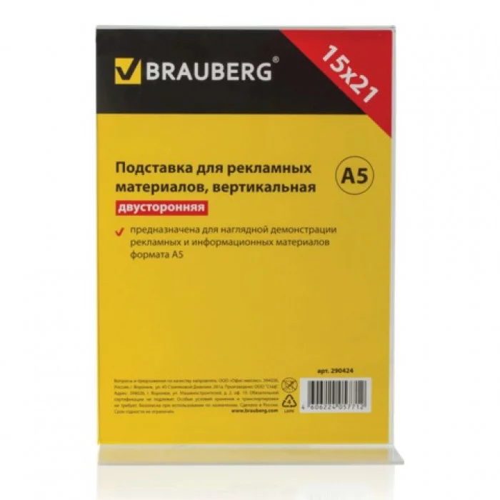 Двусторонняя вертикальная настольная подставка BRAUBERG подходит для размещения меню, рекламных материалов формата А5. Изготовлена из прозрачного акрилового стекла. Предназначена для настольного размещения. Формат А5 и меньше. Максимальная высота вставляемого листа - 210 мм, максимальная ширина вставляемого листа - 150 мм.