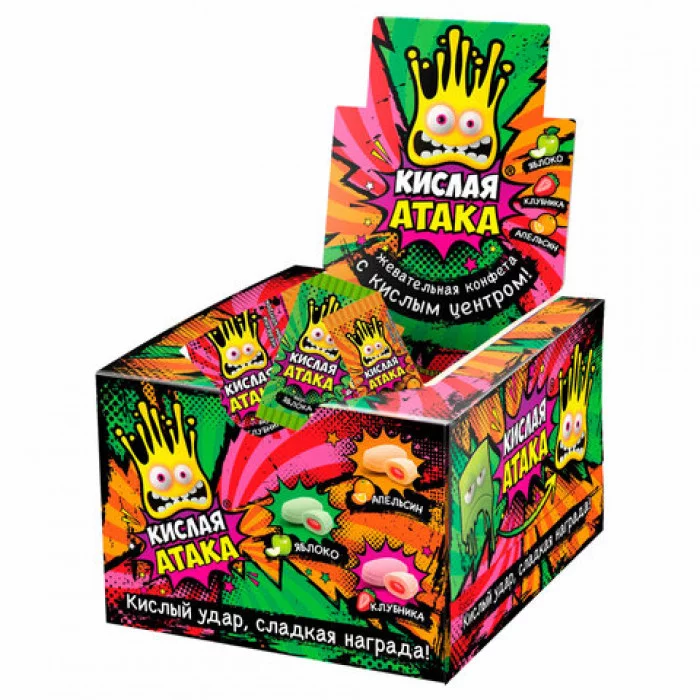 Конфета жевательная КИСЛАЯ АТАКА с кислым центром, ассорти 3 вкусов, 4, 5 г, KA-1-1