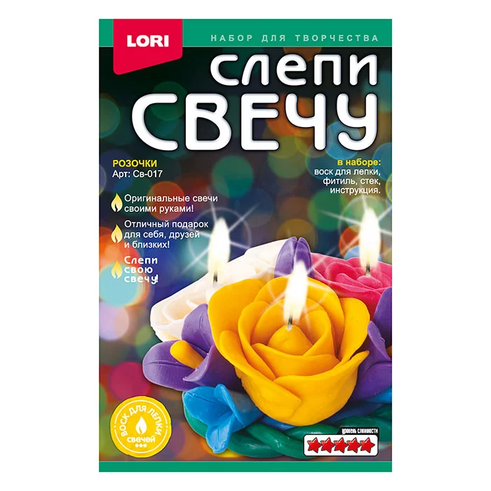 Размер упаковки- 21*14*4 см Эта серия наборов позволит Вам создать оригинальные свечи своими руками. Изделие станет не только украшением интерьера, но и послужит отличным подарком для друзей и близких. Комплектация: воск для лепки свечей, фитиль, стек, инструкция Тип коробки: картонная коробка Вес набора: 0,191 кг.