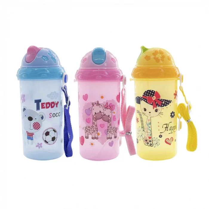 Бутылка для воды Alingar, детская, пластик, 620 мл, силиконовая трубочка, уплотнитель, держатель, ремешок, ассорти, "Веселые зверюшки" AL10487