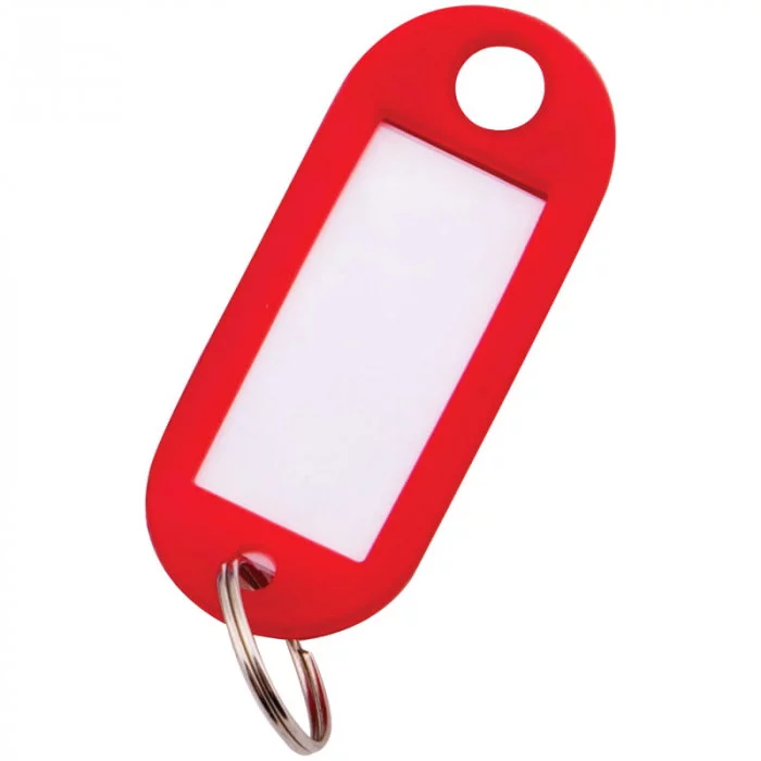 Брелоки для ключей с информационным окном и бумажной вставкой для пометок. Размер брелока 52*22 мм, размер окна 32х14мм. Материал -мягкий пластик. Цвет красный. Упаковка по 10 шт.