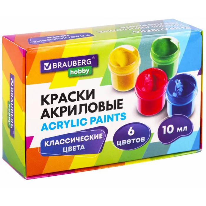 Краски акриловые для рисования и творчества 6 цветов по 10 мл, BRAUBERG HOBBY, 192432