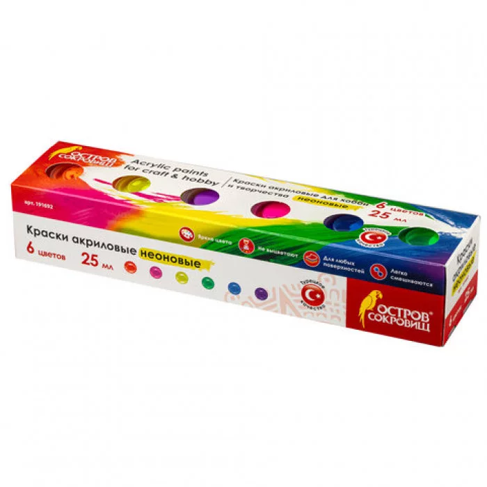Краски акриловые НЕОН для рисования и хобби ОСТРОВ СОКРОВИЩ 6 цветов по 25 мл, 191692