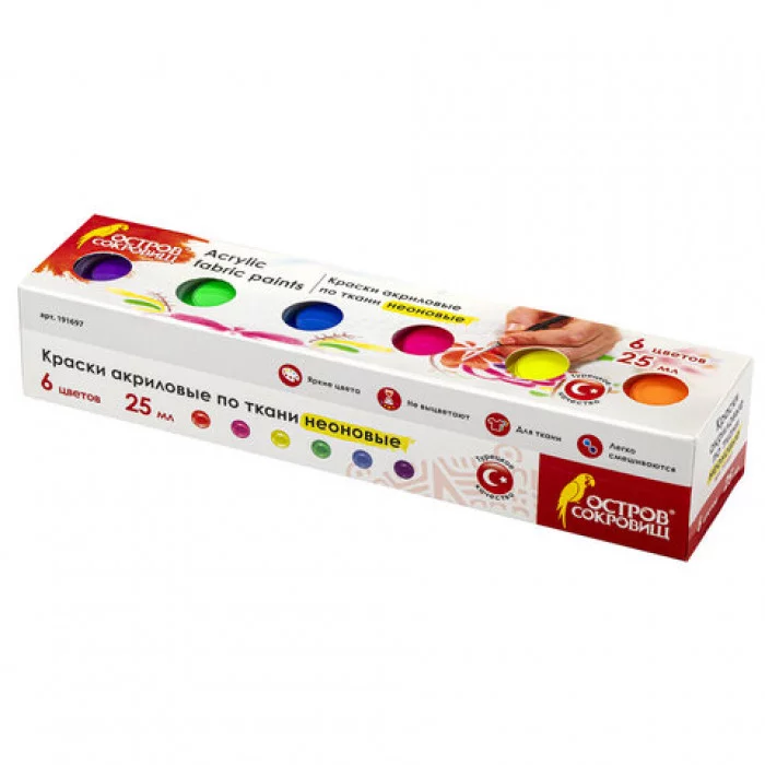 Акриловые краски ОСТРОВ СОКРОВИЩ отлично подойдут для рисования и оформительских работ. Обеспечивают быстрое высыхание без изменения цвета. Используются для любительской росписи по ткани. В наборе 6 насыщенных неоновых цветов: голубой, желтый, зеленый, оранжевый, розовый, фиолетовый. Краски обладают высокой кроющей способностью, отлично смешиваются, не тускнеют после высыхания и не выгорают при воздействии солнечных лучей. Правила ухода за изделием после нанесения краски:-для закрепления рисунка ткань необходимо прогладить с обратной стороны после высыхания краски;-температура стирки 30 - 40 градусов С;-умеренная концентрация нейтральных моющих средств (порошок) без отбеливателей;-после стирки не выжимать скручиванием;-при стирке руками места, где нанесена роспись, не тереть;-перед стиркой изделие лучше вывернуть наизнанку;-сушить в расправленном виде;-не подвергать предварительной стирке (замачиванию);-гладить щадяще и с изнаночной стороны. Тип товара: краски. Тип краски: матовые акриловые по ткани. Количест